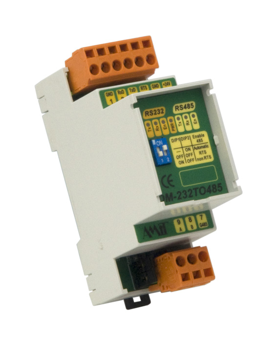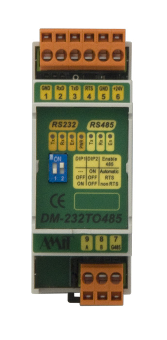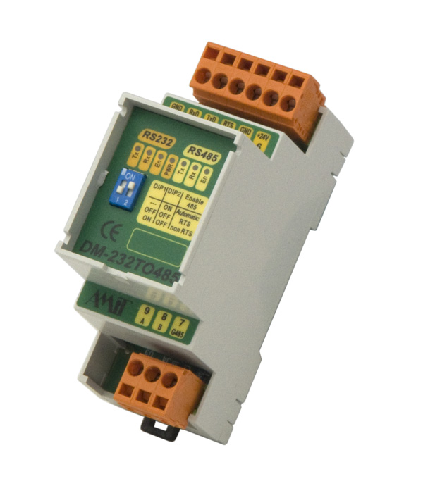 A DM-232TO485 ipari konverter 35 mm-es sínre szerelhető. Az eszköz célja, hogy megteremtse a kapcsolatot egy RS232-vel kommunikáló és egy RS485-tel kommunikáló rendszer között.