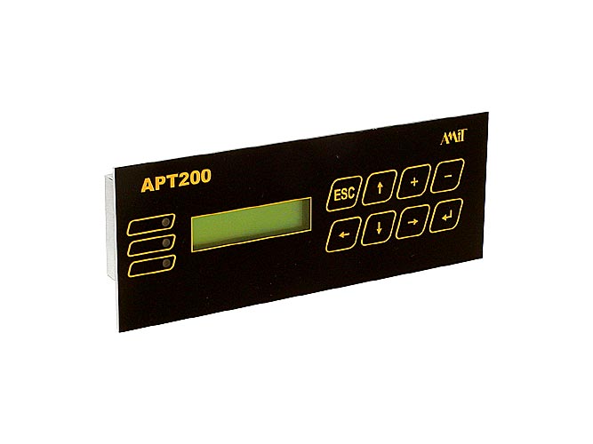 KijelzőLCD black-lit kijelző, 2x16 karakter, kurzor, 5x8 pontú karakter mátrix vagy VDF-green kijelző, 2x16 karakter, kurzor, 5x8 pontú karakter mátrix (APT200F)