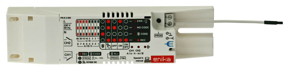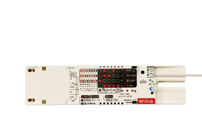 Kétcsatornás, felületszerelhető relémodul. 2 darab 230V-ról működő eszköz be- és kikapcsolásának vezérlésére alkalmas. Az eszköz programozható, így egyszerűbb feladatoknál nincs szükség központi vezérlőegységre. A többi vevőhöz hasonlóan repeater-ként is használható nagyobb távolságok áthidalásánál.